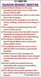(1) Swachh Bharat MisSion is a massive mass movement that seeks to create a clean India by 2019 The father of our nation, Mahatma Gandhi, always puts etnphas on cleanliness as cleanliness leads to a healthy and prosperous life. Keeping this in mind,the Indian Governmentlaunched the Swachh Bharat Mission on Octuber of 2, 2014. The mission will cover all rural and urban areas. The urban component of the mission was implemented by the Ministry of Urban Development, and rural component by the Ministry of Drinking Water and Sanitation.
